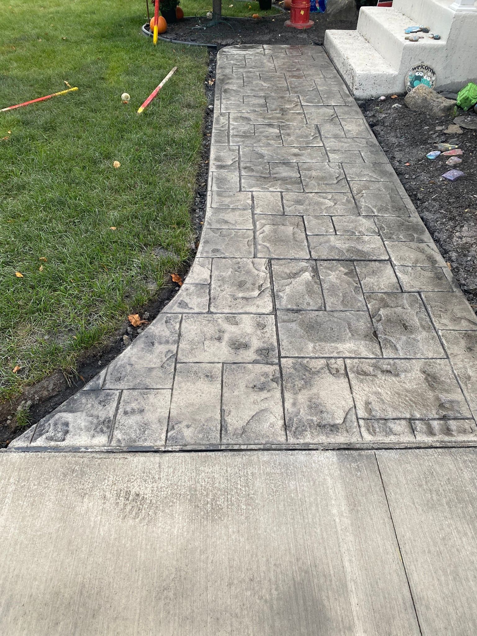 You will see a continuous surface with no gaps for water to collect or freeze, no individual units that can shift or settle, and a pattern that visually breaks up the uniformity of a plain concrete slab. The texture provides slip resistance when wet, and the sealer helps prevent staining from leaves, dirt, or outdoor furniture. Because the concrete is poured as a single piece, you will not need to reset pavers or refill joint sand each spring after frost heave has disrupted the surface.